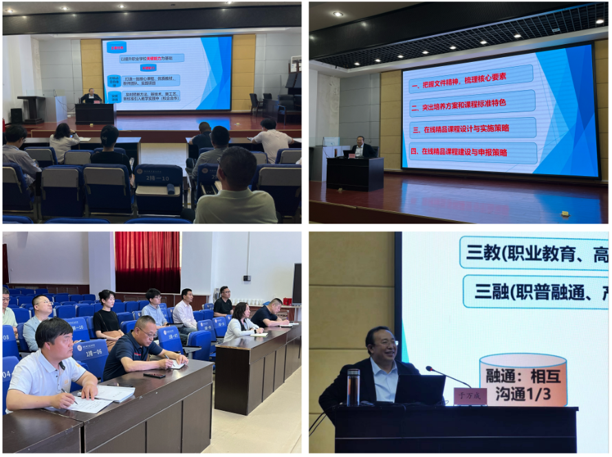 于教授以《职业教育在线精品课程建设策略》为题,从把握文件精神,梳理核心要素;突出培养方案和课程标准特色;在线精品课程设计与实施策略;在线精品课程建设与申报策略等方面, 帮助教师掌握建设精品在线开放课程和开发新形态一体化教材的要求,助推学校数字化教学资源建设。于教授针对学校课程资源建设实际,做了详细分享,从小到大,由点到面,着重分享课程建设的重点内容,为我校在线精品课程的申报与建设提供指导。同时,针对在线精品课程申报材料、建设内容和运行要点作出了补充和完善,融理论性与实践性于一体,既有思想的引导与启迪,更有实践的指导与传授。于教授认为好的脚本是课程成功的第一步;要充分享受过程,倾心投入,用心经营,就会收获满满的幸福感和成就感;开弓没有回头箭,从课程建设的第一刻开始,便永远在路上。