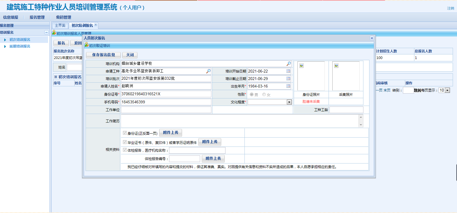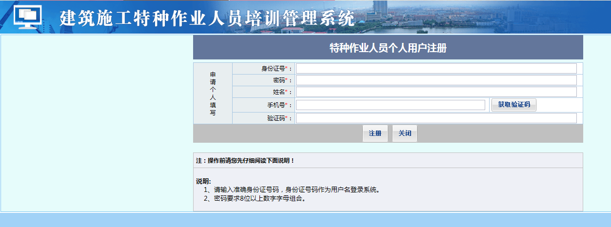 已取得“山东省建筑施工特种作业操作资格证”的同志,证书到期前12个月开始,男士不超过60周岁、女士不超过55周岁,身体健康无妨碍从事建筑施工特种作业工作的生理疾病及心理疾病均可报名。参加烟台城乡建设学校特种作业人员人员培训的学员,需通过http://47.104.137.177/tzzy/Login/CityIndex.aspx?citycode=F网站进行报名。报名基本流程与个人用户相同,此处不进行累述。