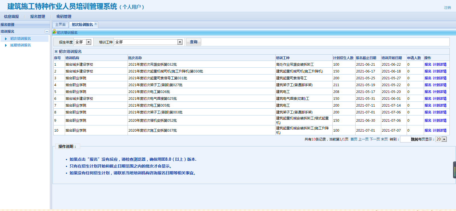 4.登录后找到“报名管理”,选择“初次培训报名”,找到相应工种的培训批次,点击“报名”。
